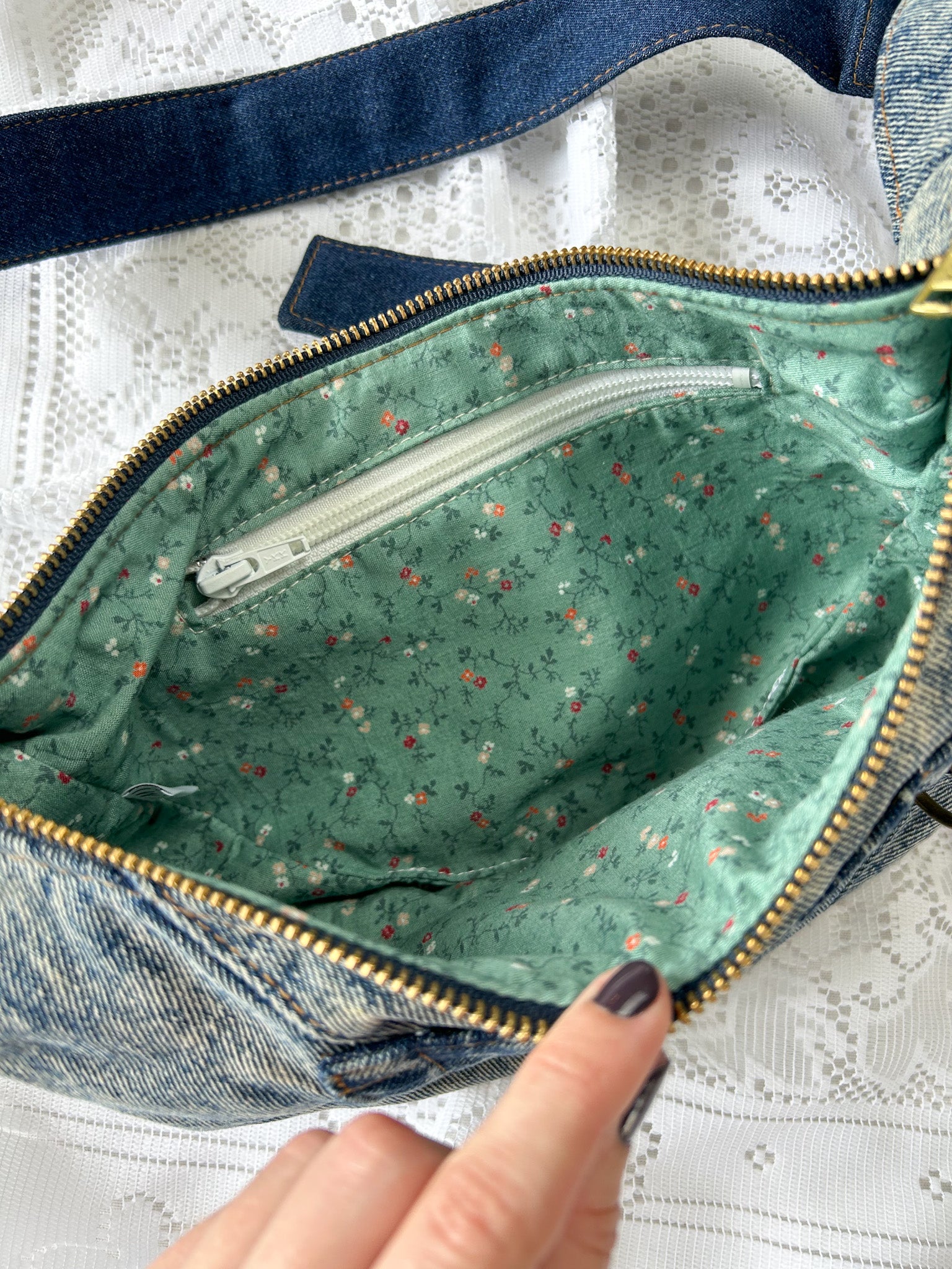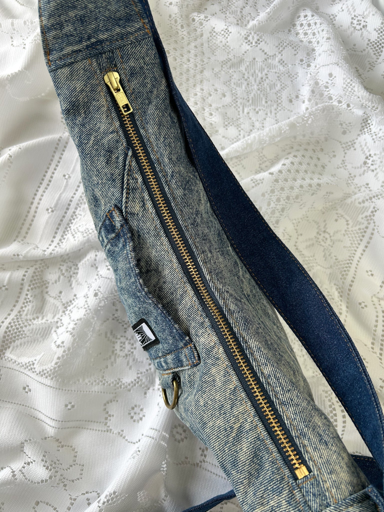 One of a kind and made by upcycling reclaimed blue acid wash jeans.