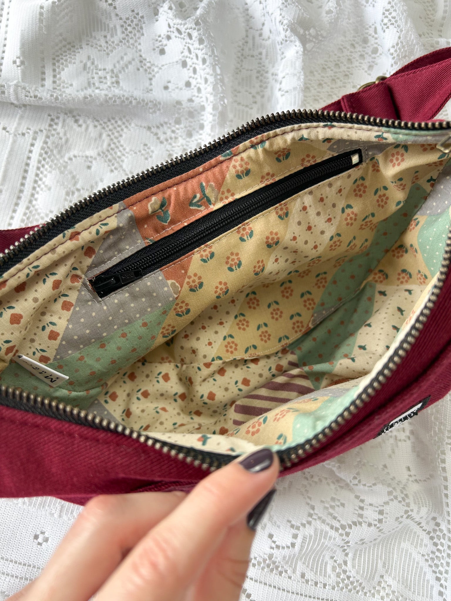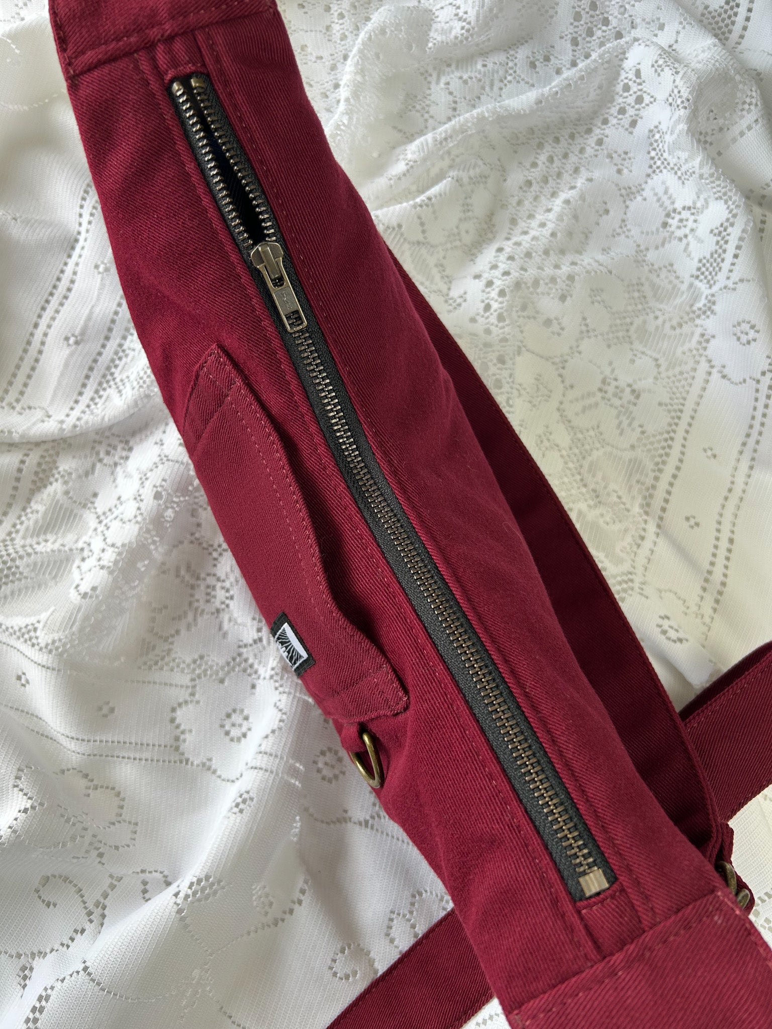 One of a kind and made by upcycling reclaimed jeans in a gorgeous and rich burgundy colour.
