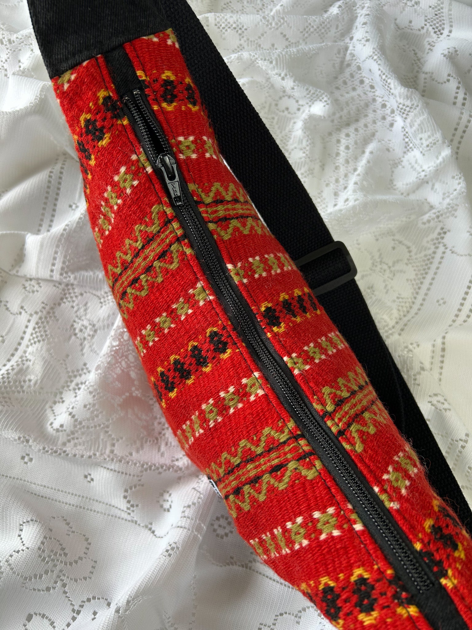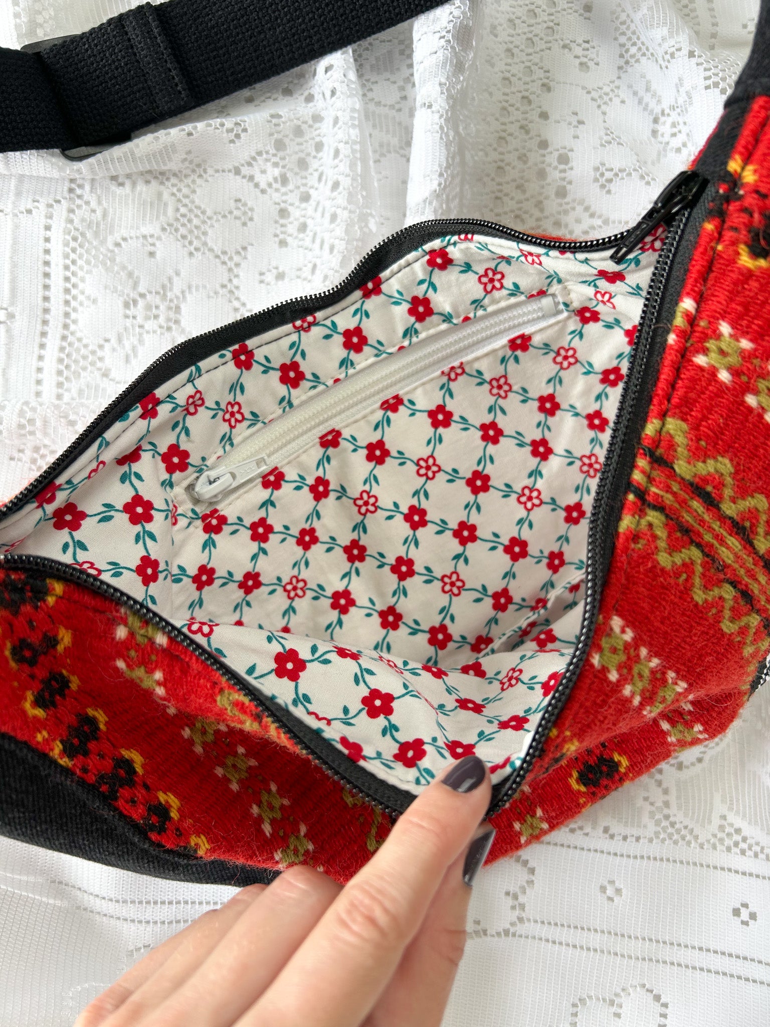 One of a kind - made by upcycling a reclaimed wool table runner and paired with black denim.