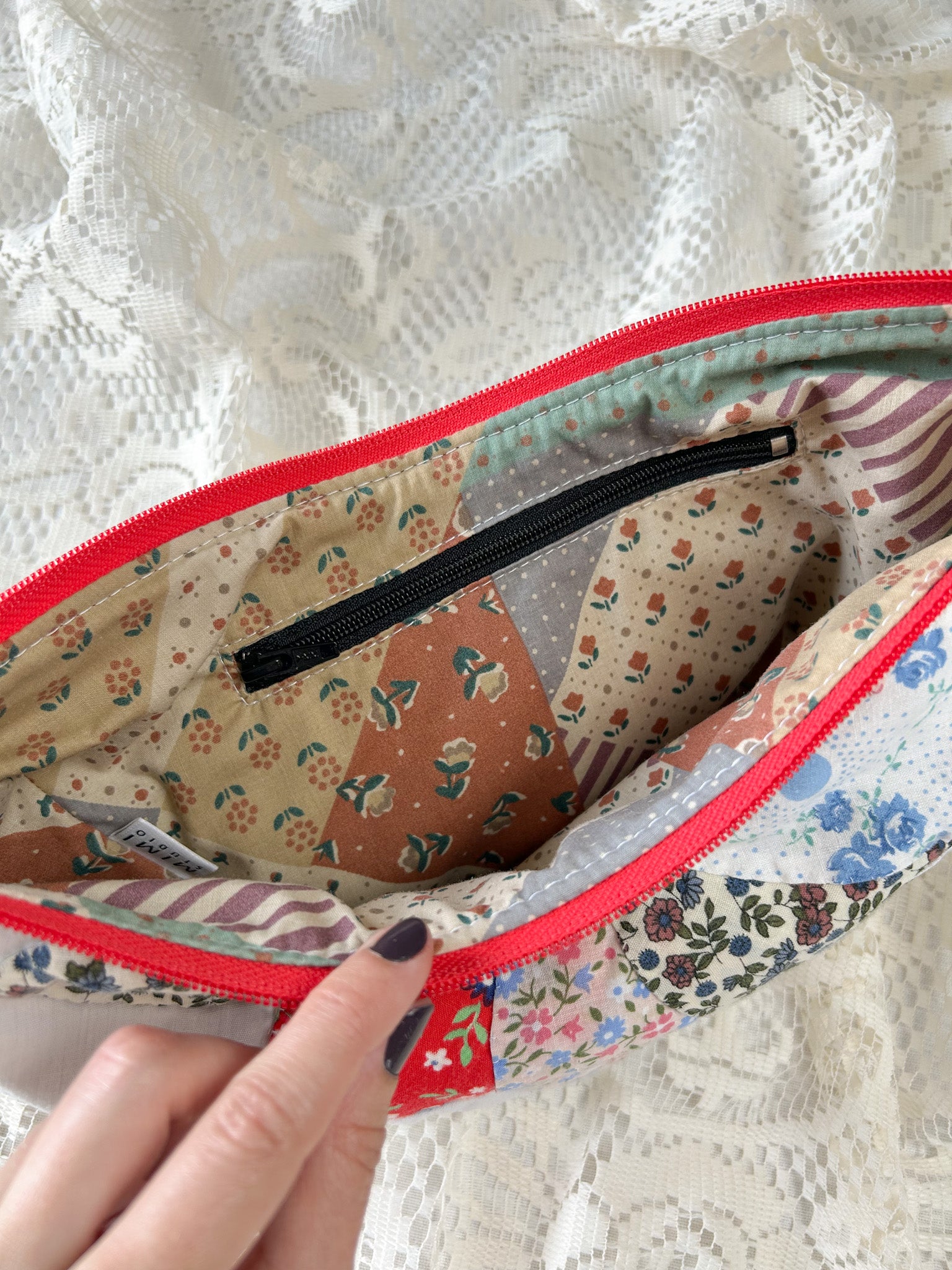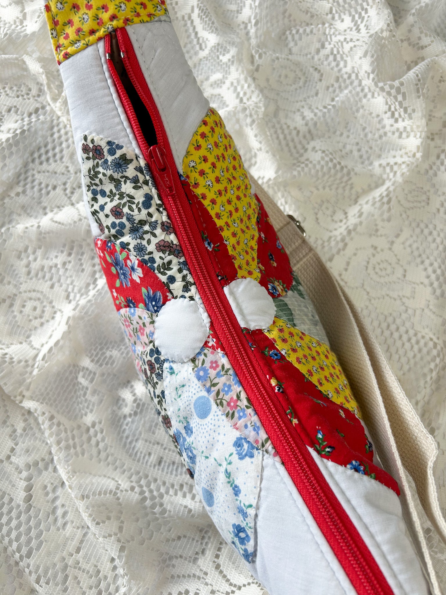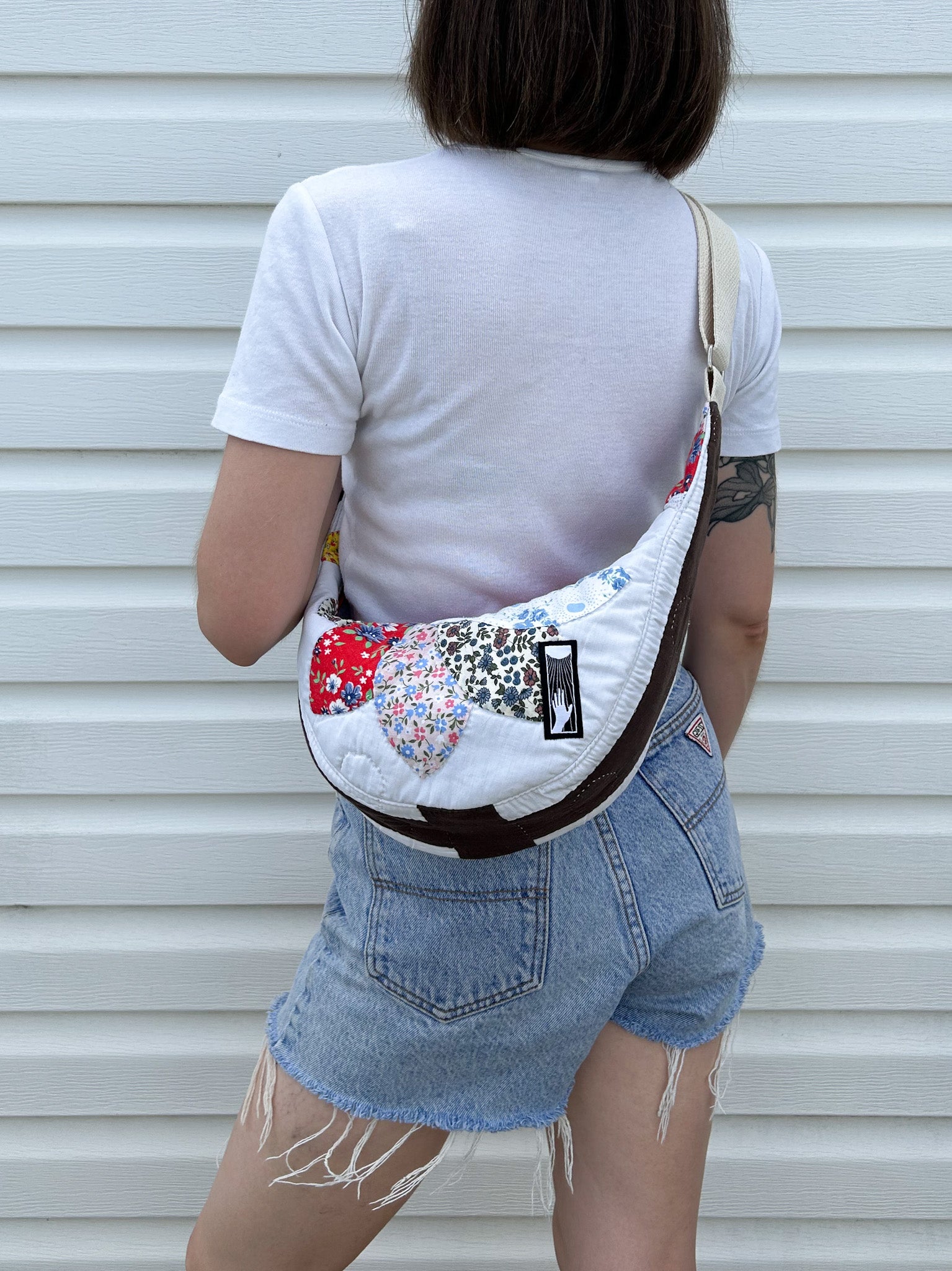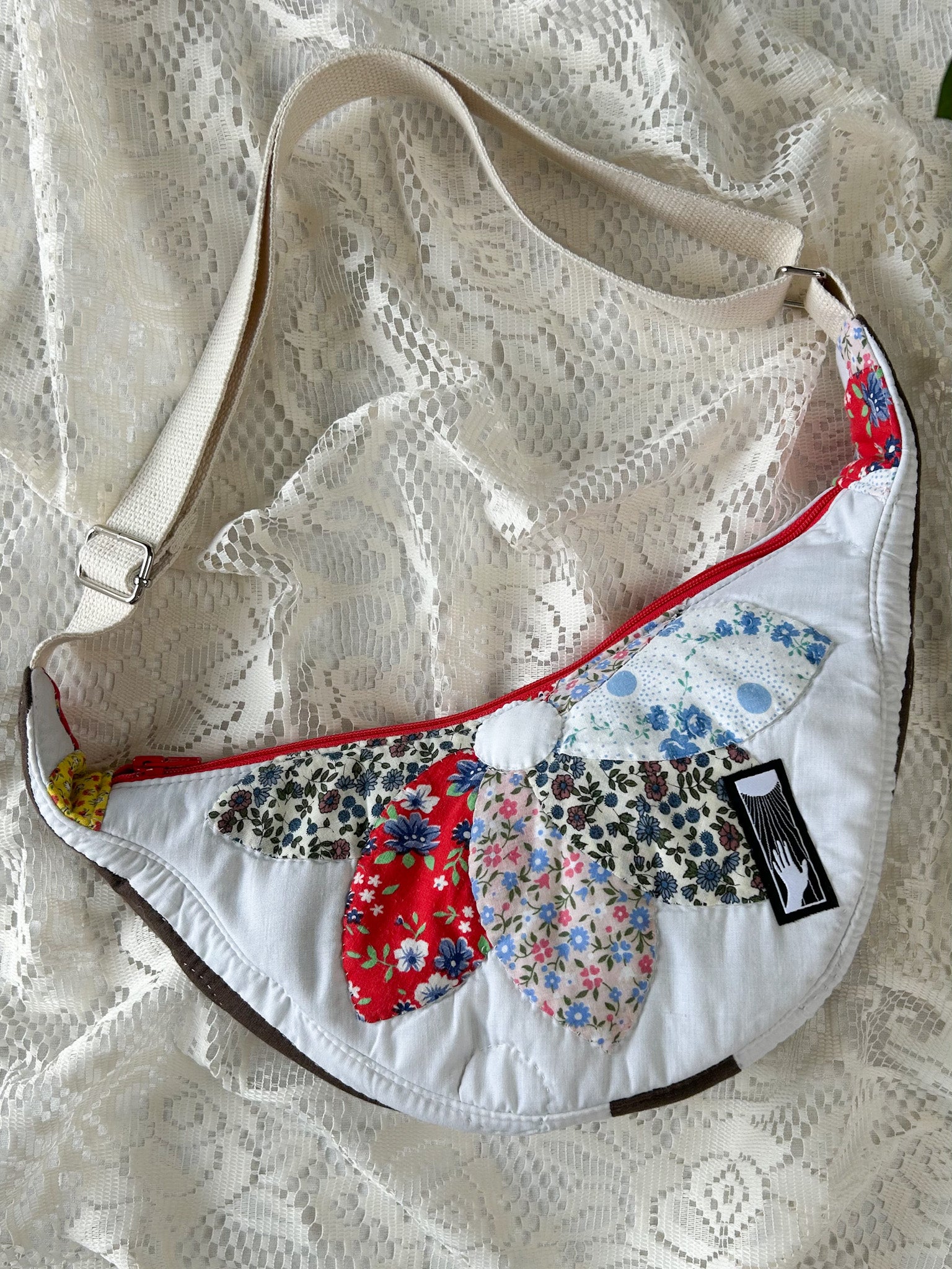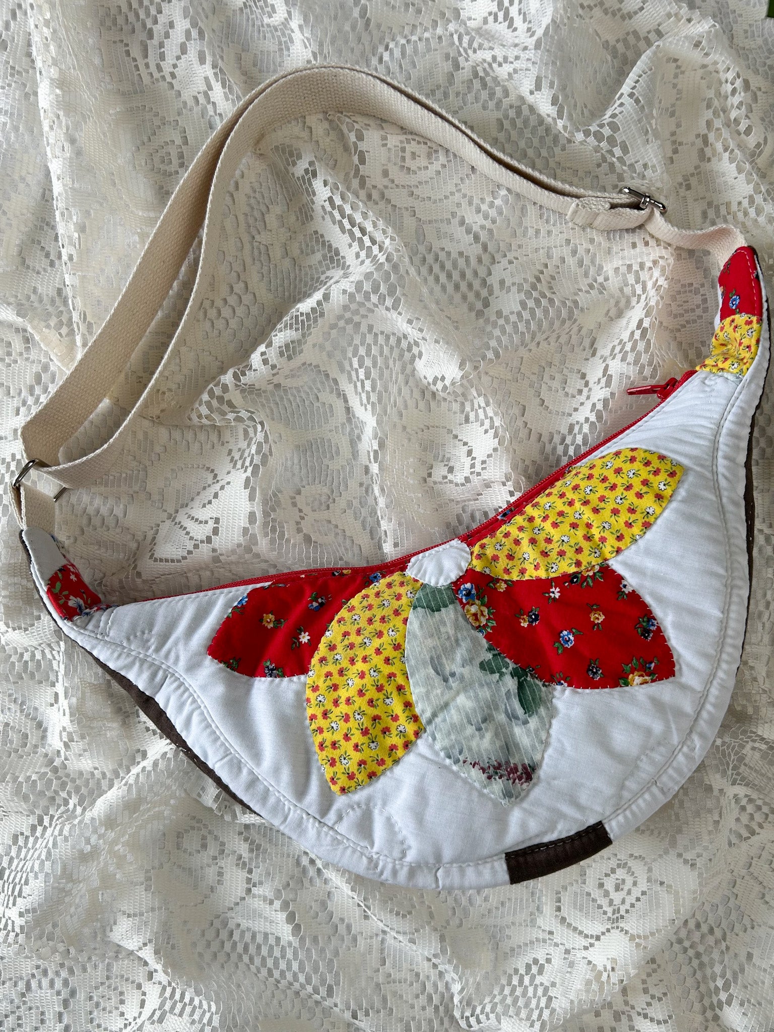 Made by upcycling a gorgeous thrifted flower quilt. Accented with lots of lovely hand-stitched details.