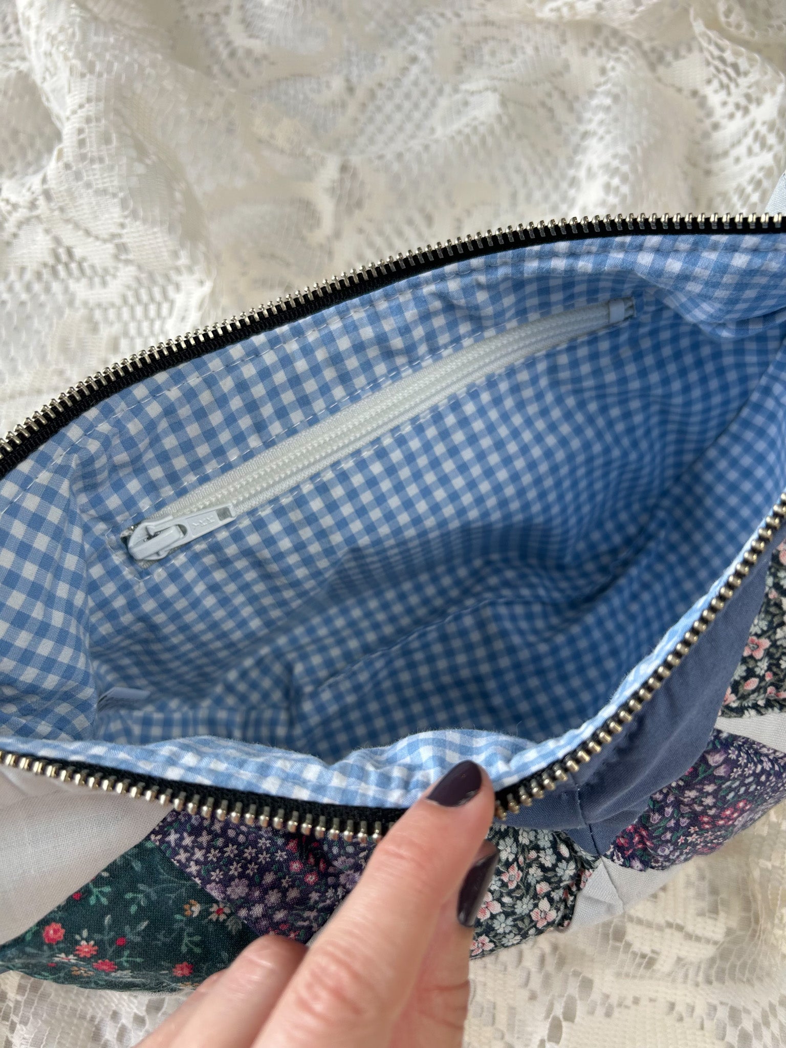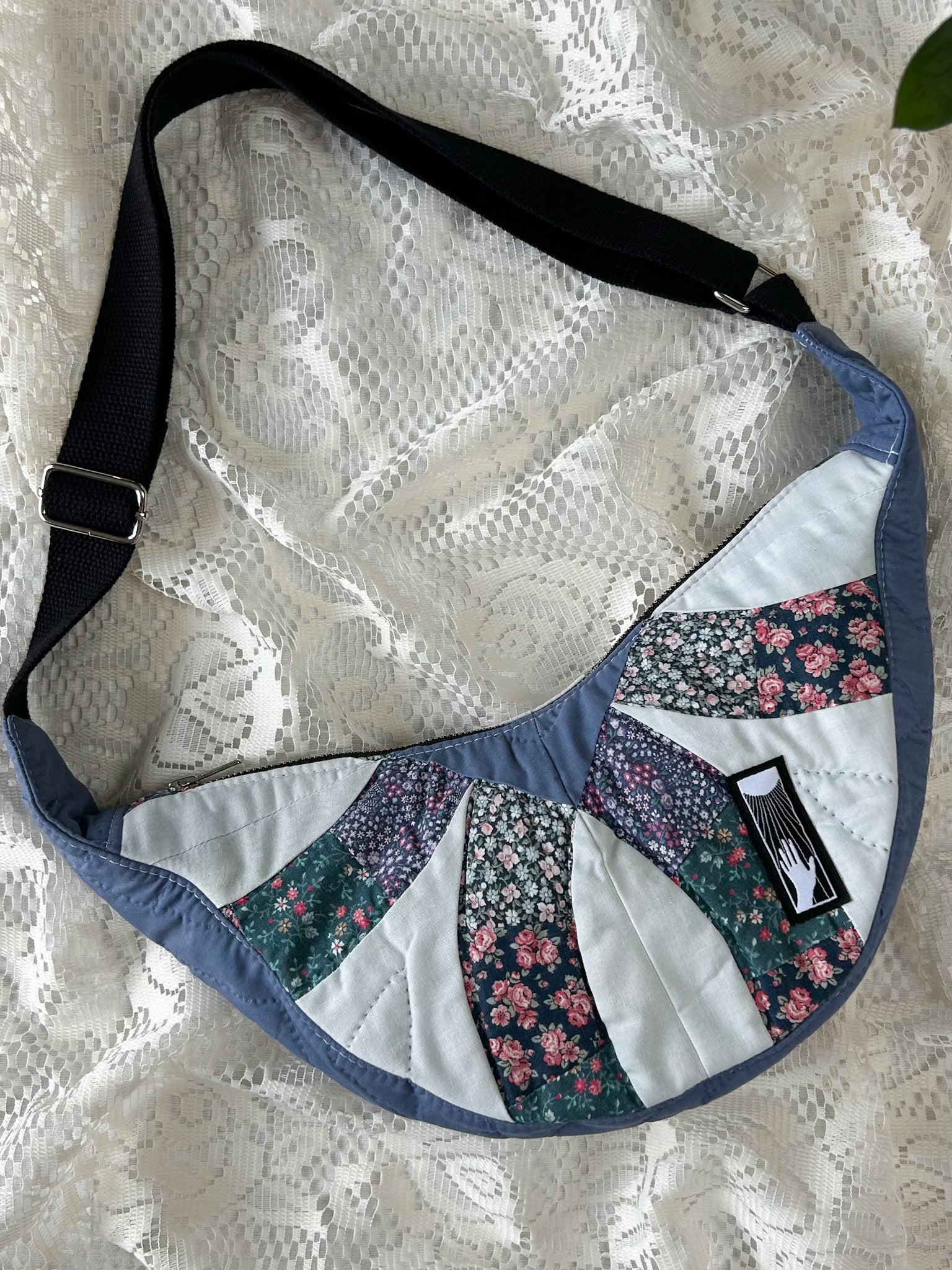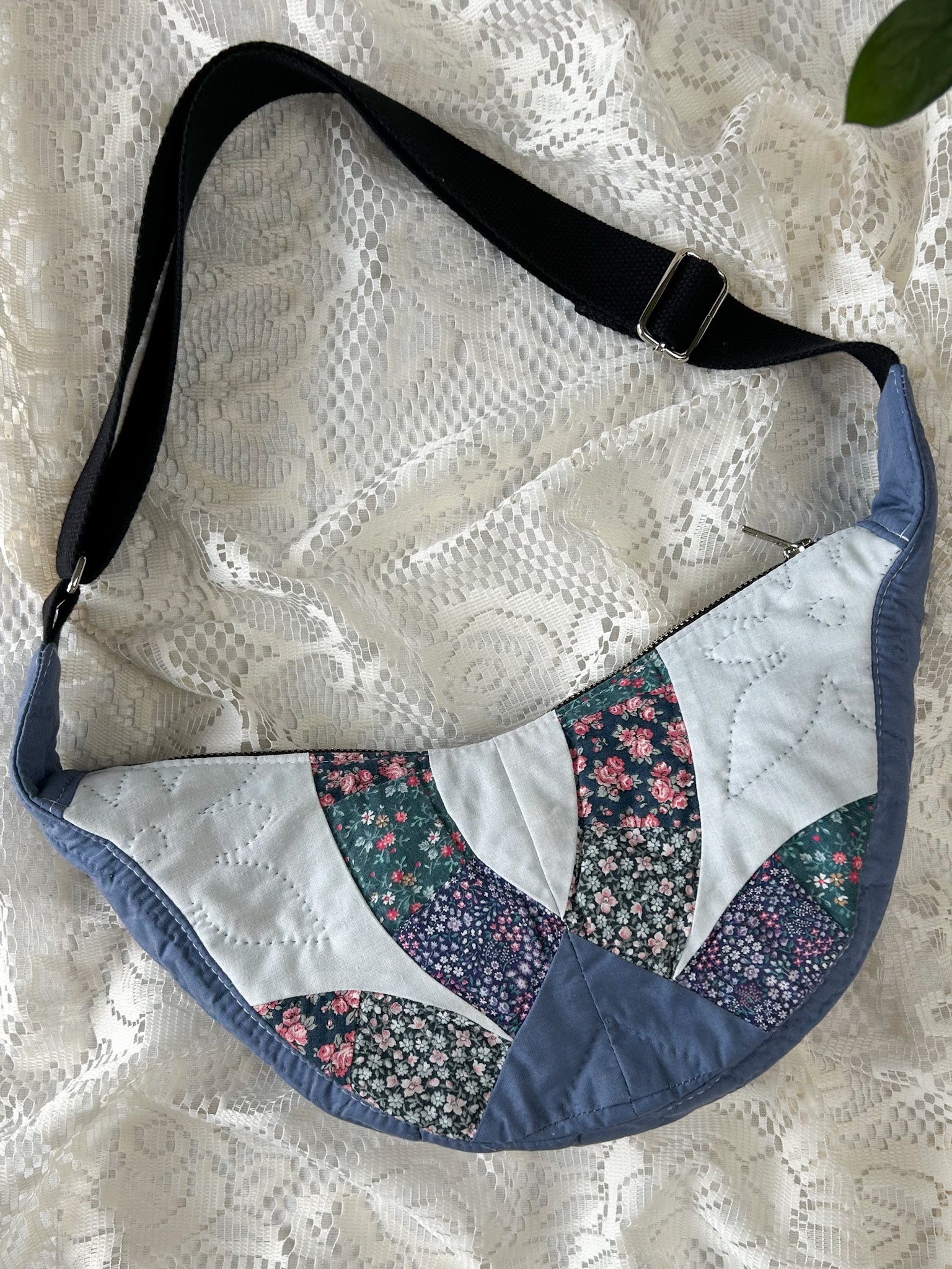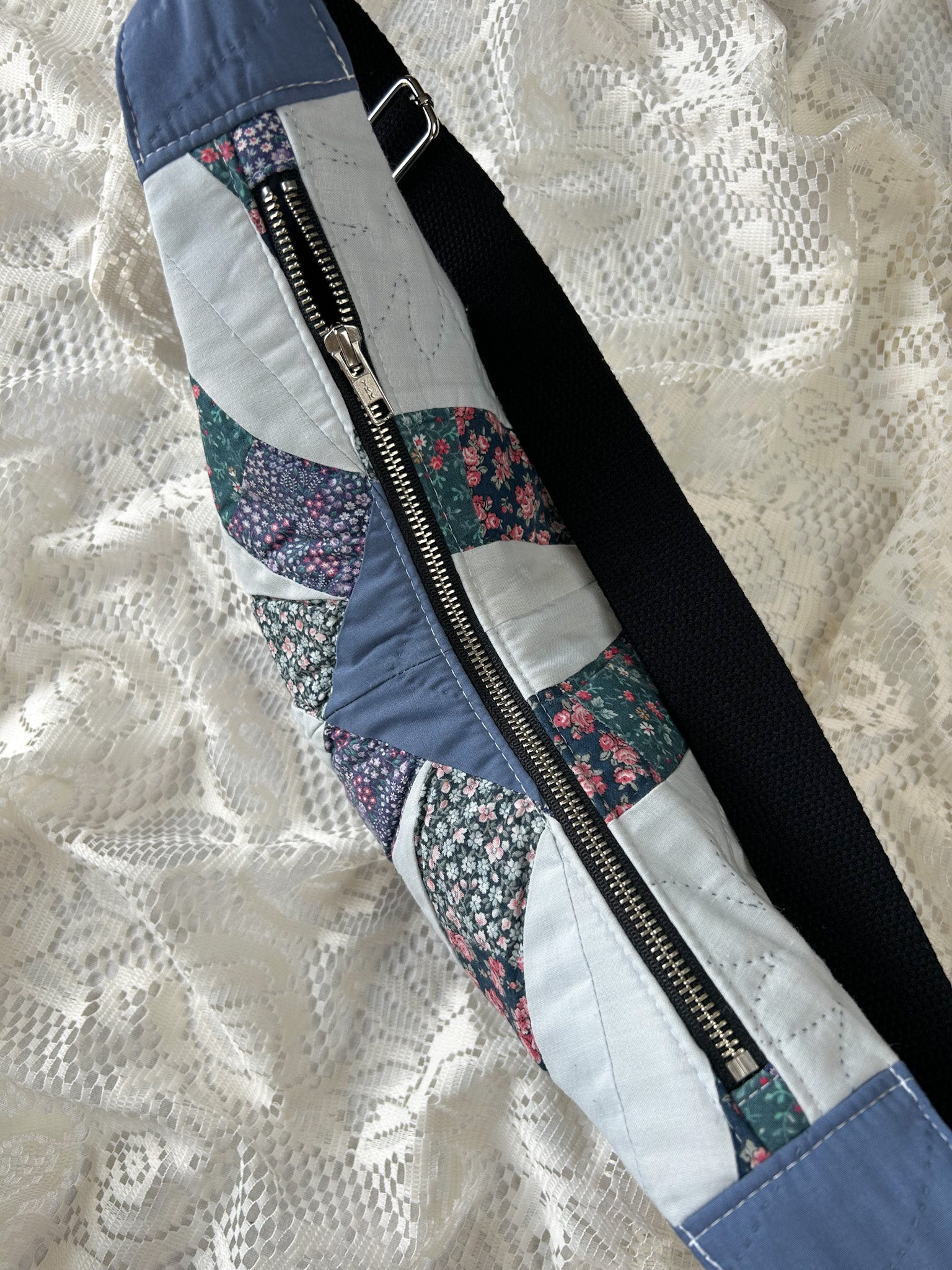 Made by upcycling a gorgeous thrifted blue floral double wedding ring quilt. Accented with lots of lovely hand-stitched details.